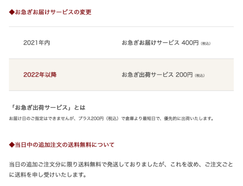 そういえば、大手通販サイトのB社は今年から「◯円以上購入で無料」となくしたところで、お急ぎ便は値下げとなったようだ。