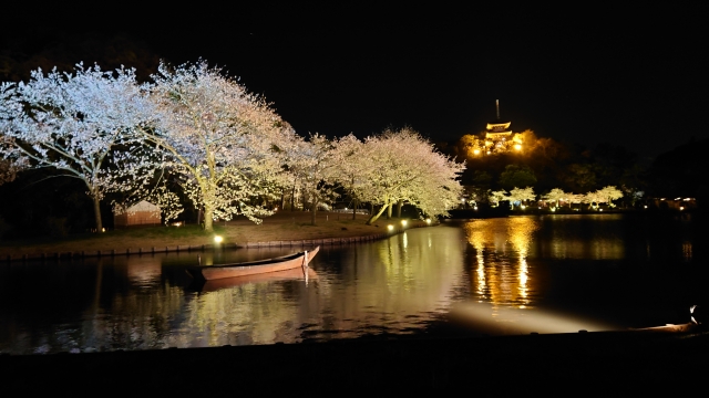 イベント期間中は開園時間が21時まで延長され、18時頃からのライトアップでは夜桜と旧燈明寺三重塔や臨春閣などの歴史的建造物が幻想的な光景を織りなします。